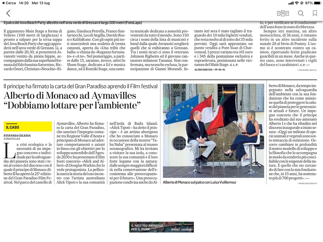 Apre con il tutto esaurito la 25ma edizione del Gran Paradiso Film Festival a Aymavilles con il Principe Alberto II di Monaco. Si prosegue il 13 e il 15 luglio nei castelli di Villeneuve e Introd