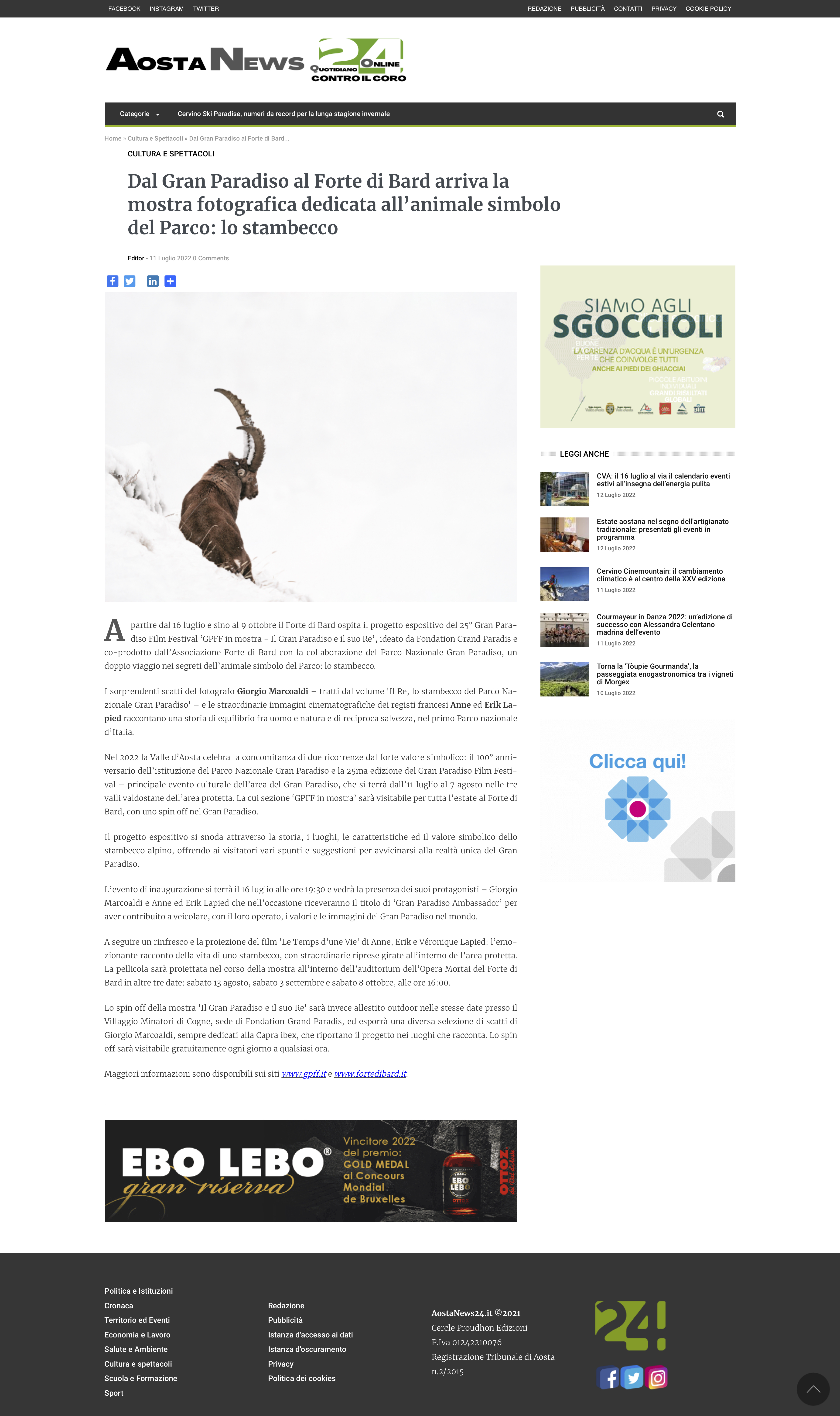 Dal Gran Paradiso al Forte di Bard arriva la mostra fotografica dedicata all’animale simbolo del Parco, lo stambecco