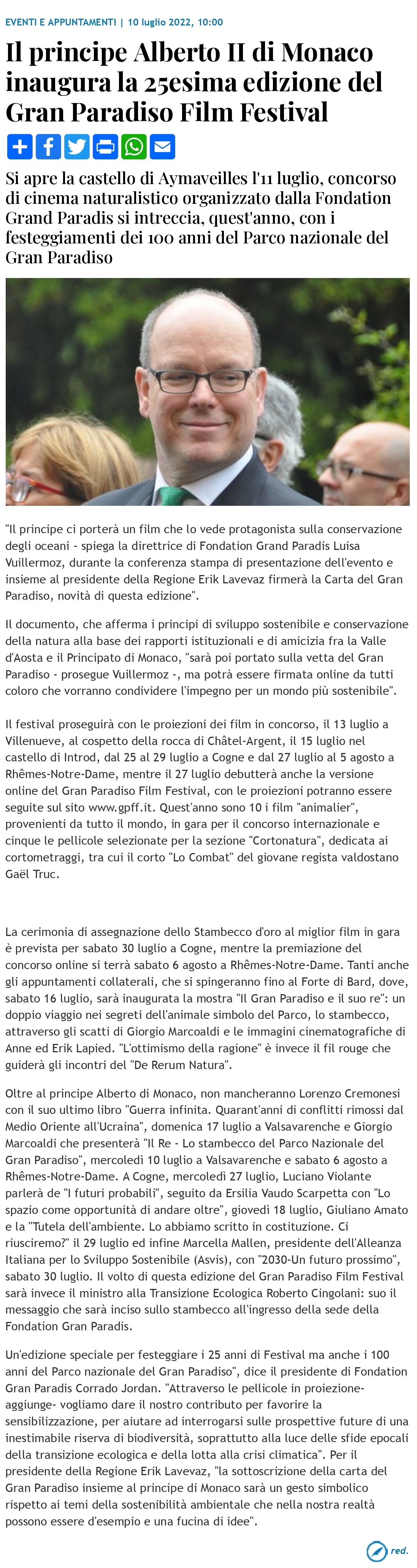 Il principe Alberto II di Monaco inaugura la 25esima edizione del Gran Paradiso Film Festival