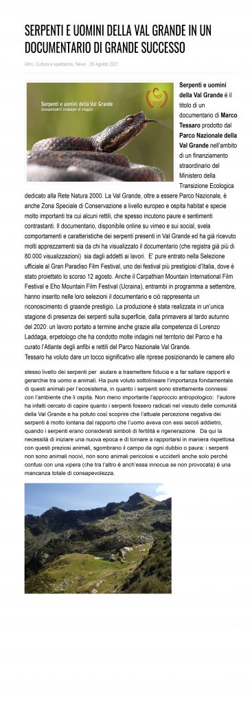 Serpenti e uomini della Val Grande in un documentario di grande successo